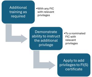 Qualifying for additional FI(S) privileges requires an FI(S) who holds the relevant privileges on their SPL to complete FI(S) additional privilege training with an FIC during or following which they demonstrate their ability to instruct to a suitably experienced FI(S) with (a)7 (i.e FIC) privileges who has been nominated by the Head of Training. Reference SFCL.315.